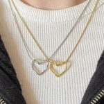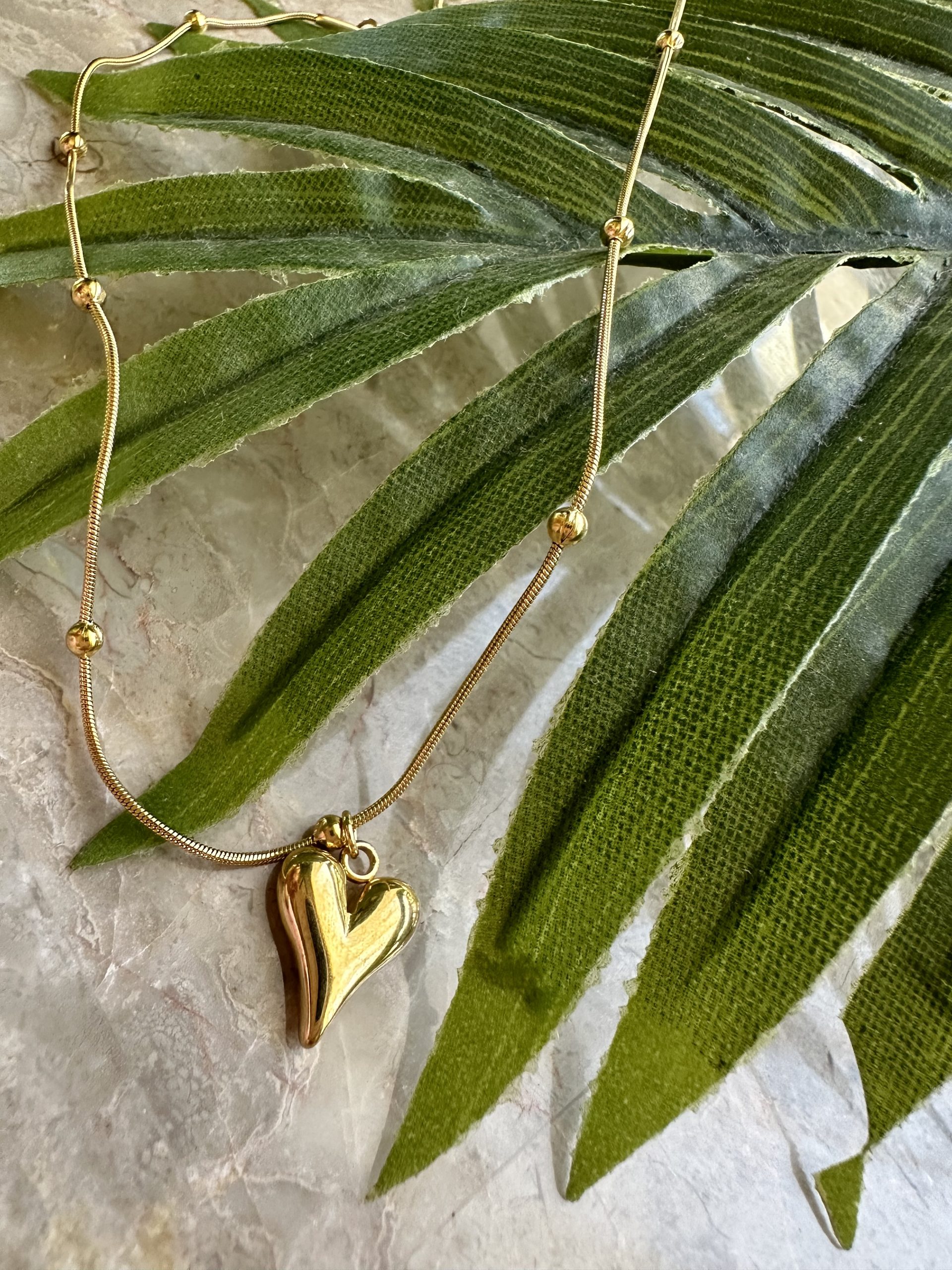 قلادة ذهبية اللون رقيقة مع سلسلة من الخرز، قلادة على شكل قلب، قلادة قلب فريدة من نوعها بتصميم ثلاثي الأبعاد وتفاصيل حبات معدنية صغيرة.