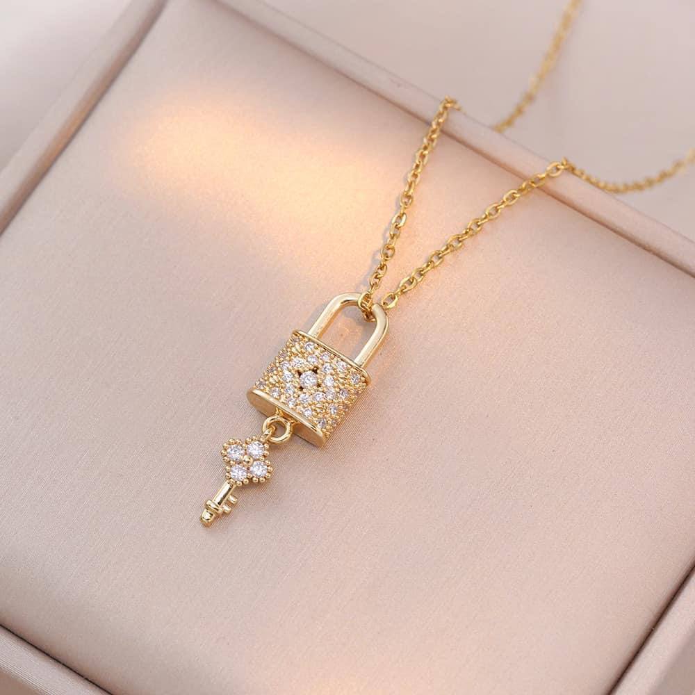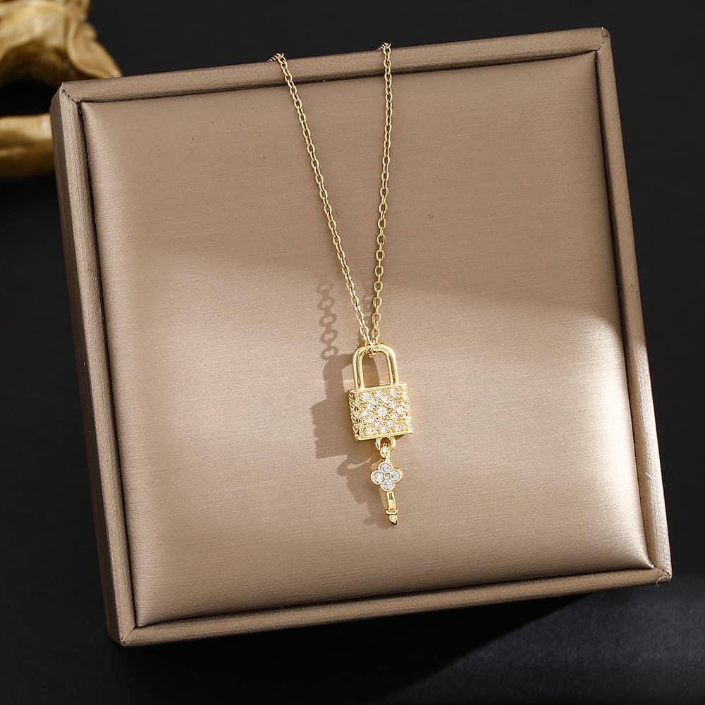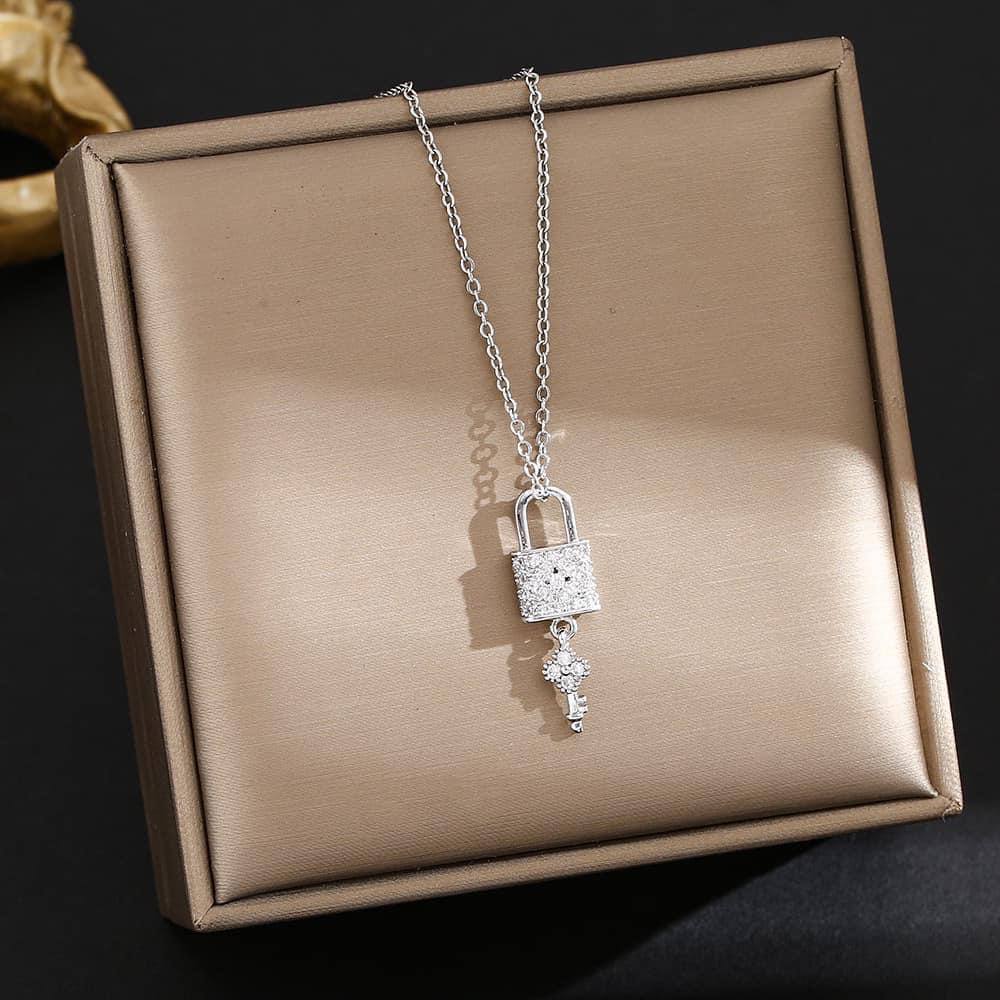 قلادة على شكل مفتاح قفل مرصعة بأحجار الراين من الستانلس ستيل المقاوم للصدأ سلسلة عصرية مجوهرات للنساء والفتيات